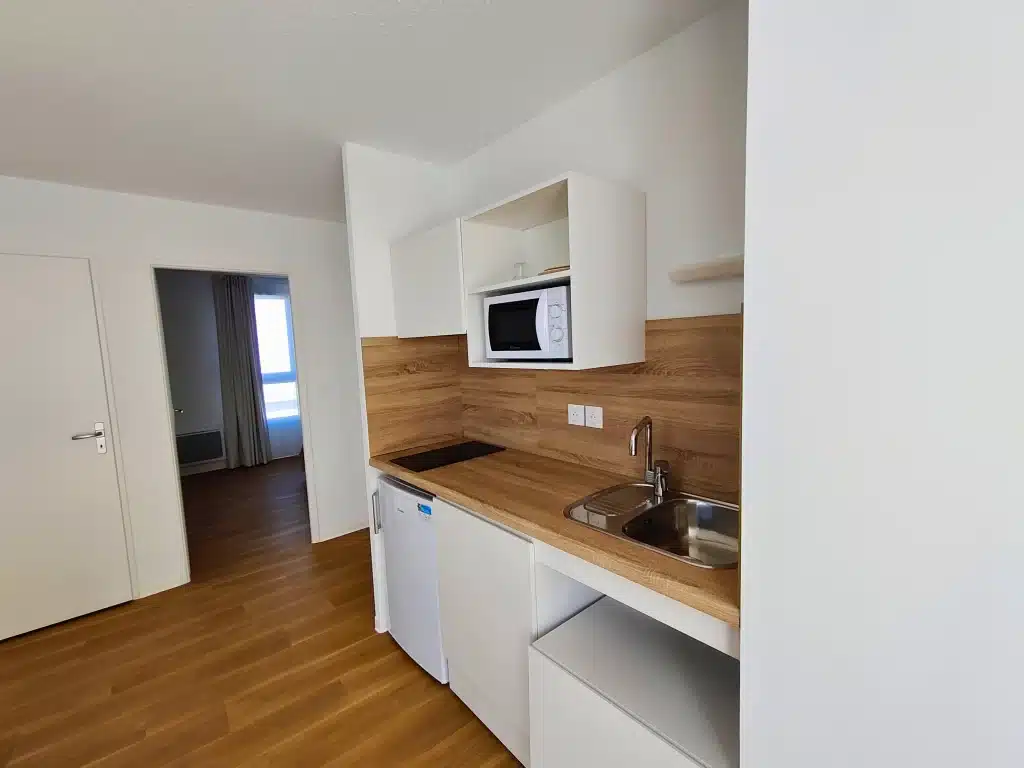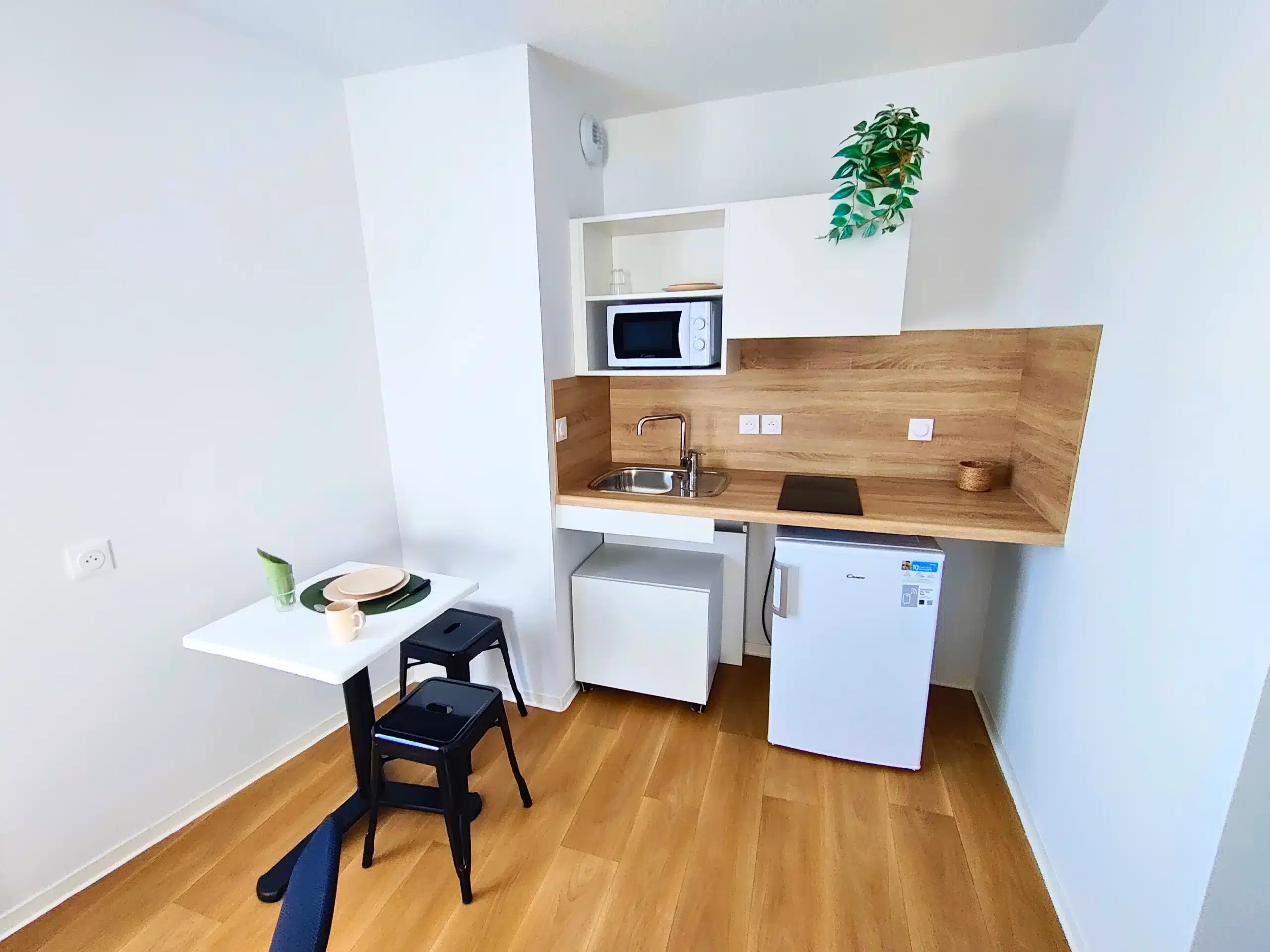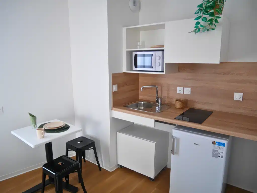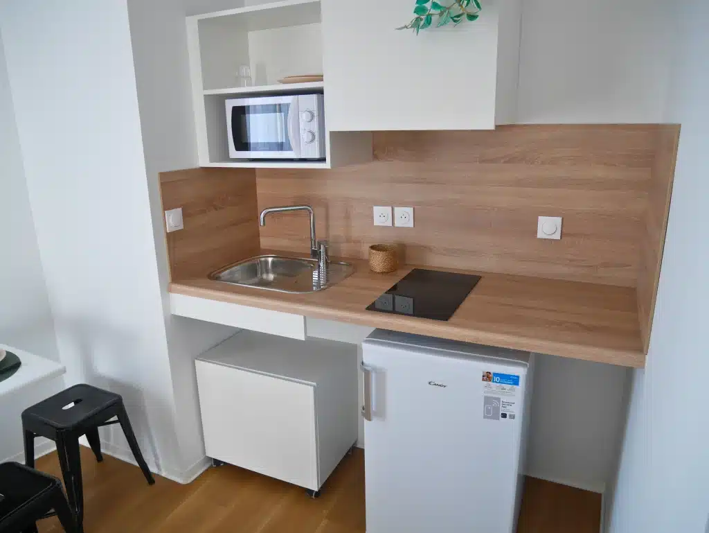 Coin cuisine équipé d’un plan de travail, placard de rangement, kit vaisselle, réfrigérateur, micro-ondes, plaques de cuisson vitrocéramiques, table, chaises.