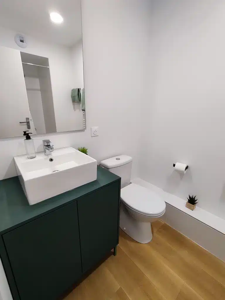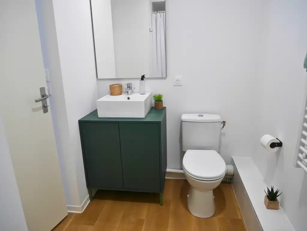 Salle de bain individuelle avec douche, lavabo, placards de rangement et toilettes.